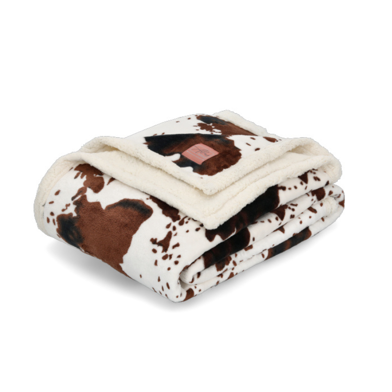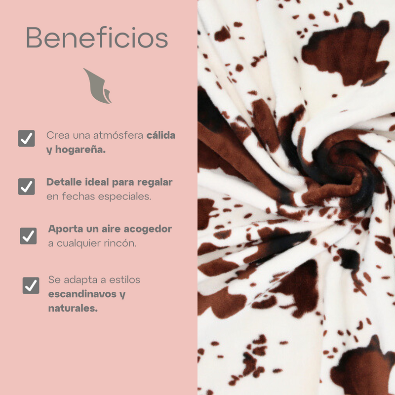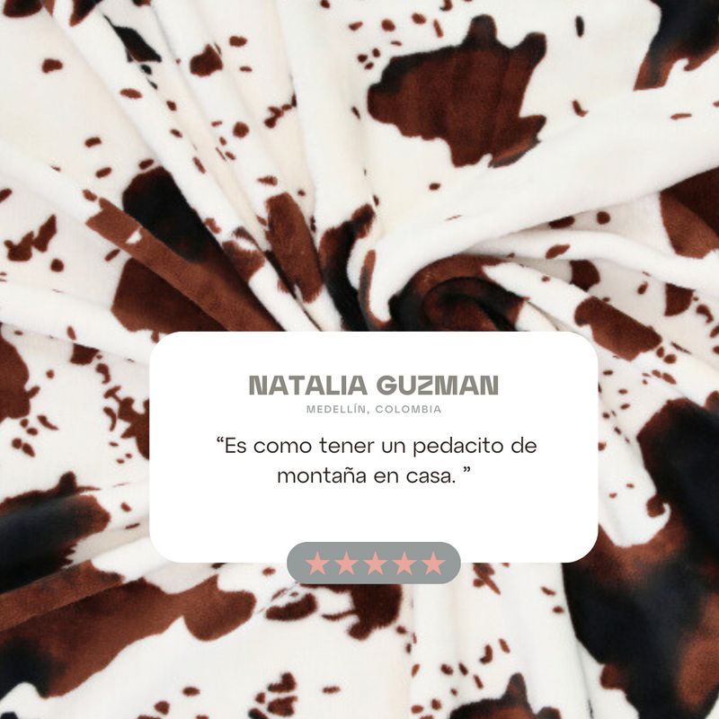 La Ovejera Premium Suiza combina suavidad y diseño en una manta inspirada en los paisajes de montaña. Su patrón de manchas negras y cafés sobre fondo blanco aporta un toque rústico, moderno y acogedor. Está hecha con materiales de alta calidad: franela en la parte superior para una textura suave y sherpa blanco en el reverso que mantiene el calor en días fríos.